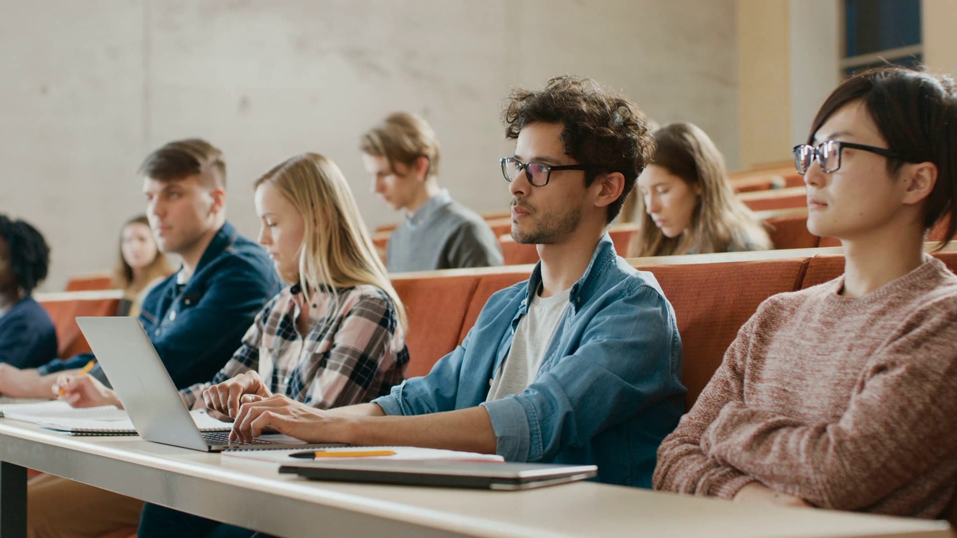 videoblocks-handsome-hispanic-student-uses-laptop-while-listening-to-a-lectur...